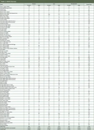 Even with roughly 95 percent of Oklahoma land being privately owned, hunters have a great opportunity to use public hunting areas such as Department-managed WMAs, national wildlife refuges, and some state parks and recreation areas. Table 2 (see below) details deer harvest by WMA, season and sex.