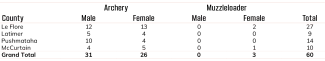 Muzzleloader hunters took 11,715 deer during the nine-day season. Archery hunters continued their string of consecutive-year record harvests, with 41,487 deer with bowhunting equipment.