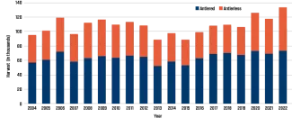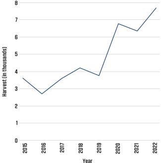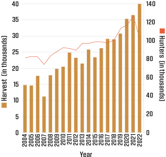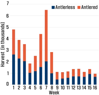 Archery season in 2022-23 remained unchanged, running uninterrupted from Oct. 1 to Jan. 15. Hunters could choose to harvest a total of six deer, with no more than two being antlered deer. See Figure 4 for the archery deer harvest by week. Figure 5 shows harvest and hunter trends over the years.