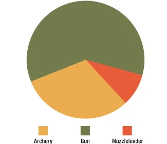 Gun seasons (the 16-day modern firearms season, youth gun season, and holiday antlerless deer gun season) continue to lead the harvest numbers. A total of 80,956 deer were taken in gun seasons last year.