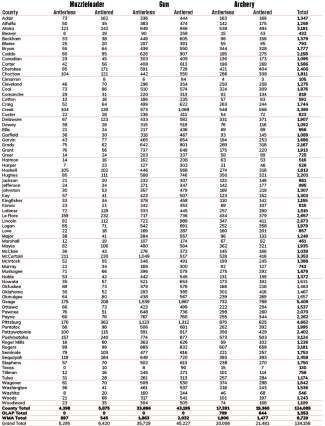 The top three deer-harvest counties were Osage County, where hunters bagged 5,409 deer; Pittsburg County, with a harvest of 4,662 deer, and Creek County, at 3,390 deer harvested.