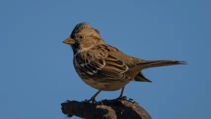 At feeders, Harris’s sparrows eat millet, milo, cracked corn and black-oil sunflower seeds. Away from feeders they eat small seeds.