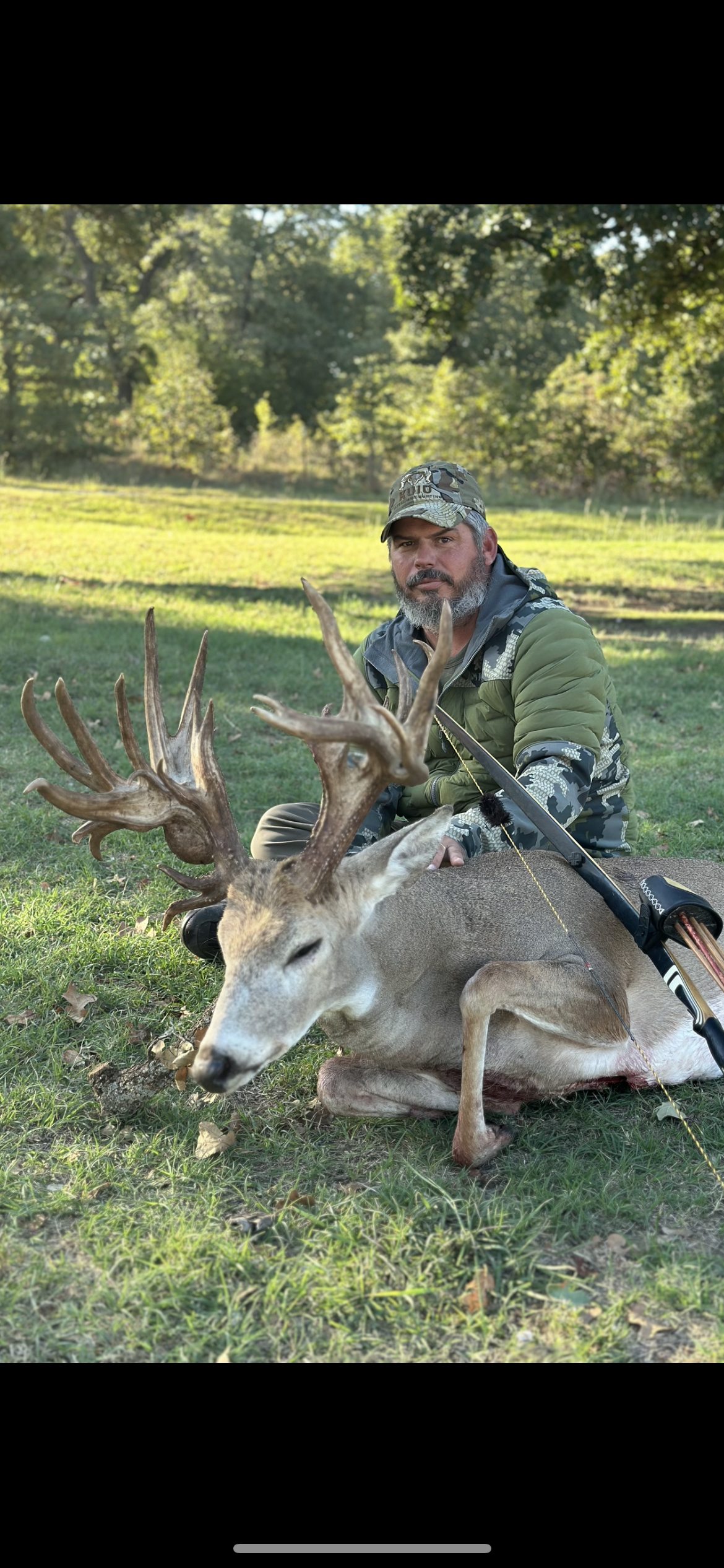 Hunter pictured with non-typical deer harvested with longbow.