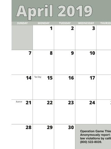 THURSDAY SATURDAY FRIDAY 6 5 4 Disturbance plays a key role in wetland habitat, and the most desired vegetation responds positively to ground disturbance such as disking. Soil disturbance at the right time of year can promote the 13 12 11 growth of desirable waterfowl food sources. To learn more about disturbance and how it can help manage your wetland, visit www.tinyurl.com/TendCattails. APRIL HABITAT MANAGEMENT PRACTICES • If conditions permit, disk wetland areas to promote moist-soil plants as needed. • Plant native grasses, forbs or legumes. APRIL POND MANAGEMENT PRACTI