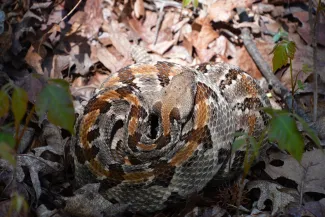 The copperhead’s incredible camouflage not only helps the snake avoid detection from potential predators, but also from potential prey. Allen described the adult snakes as ambush predators that spend time in brushy or leaf-littered areas as well as near water sources, where their prey of small rodents and amphibians may be found.