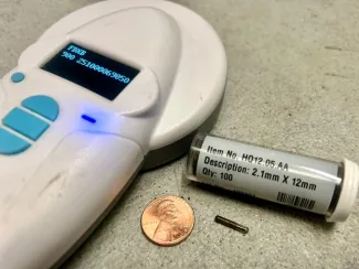 Similar to the microchips used by veterinarians to identify pets, PIT tags (or Passive Integrated Transponders) are often used in fish and wildlife studies to identify individual animals. The tag has no battery but is activated by a signal emitted by the handheld scanner, causing the tag to respond with a code unique to that fish, which is shown on the display. This same technology is used by Pikepass to identify vehicles driving on Oklahoma turnpikes. In long-term studies, individual fish growth and movements can be accurately tracked using these tags.