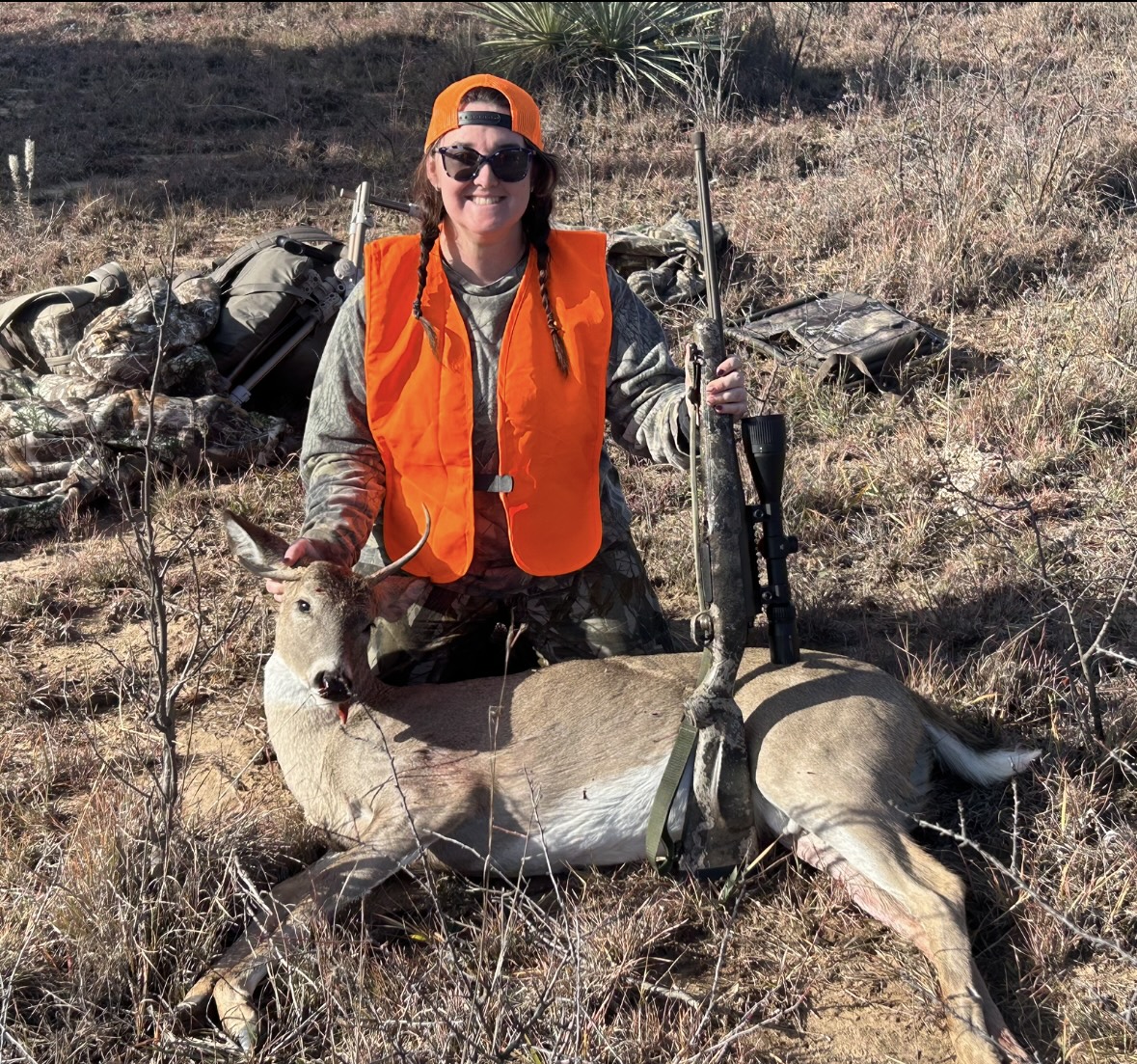 Wrenly Collins with her harvested Oklahoma whitetail deer.