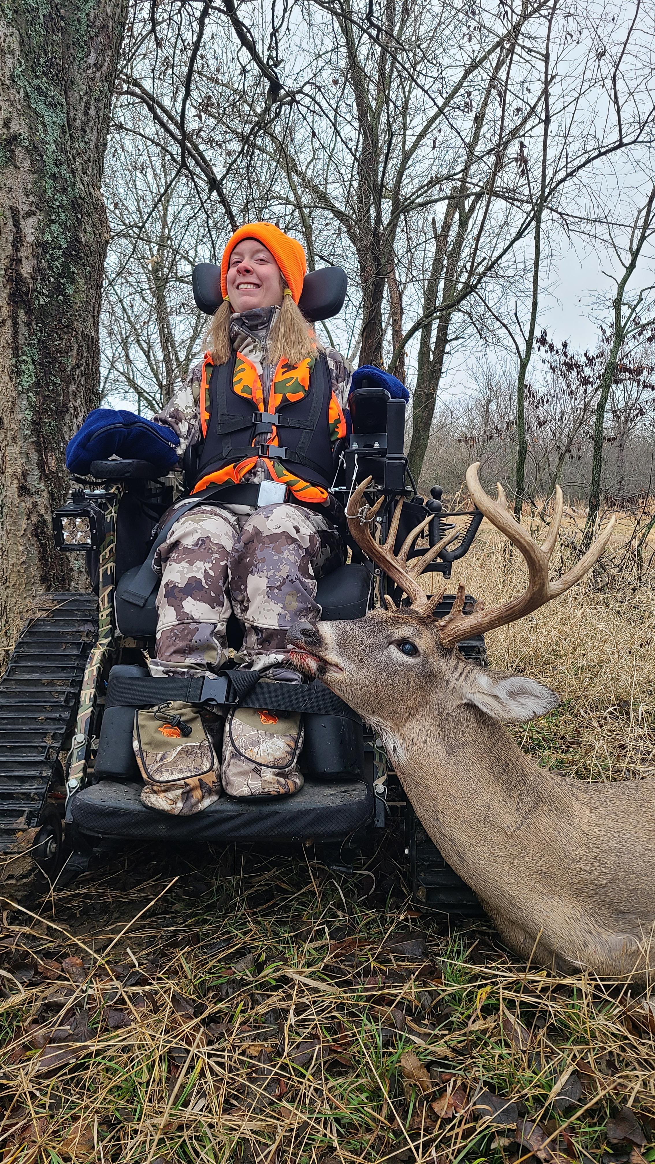 Hunter wearing orange pictured with a harvested deer. Note from her father, Mike Burnside - "My daughter Kenzi uses a vacuum air actuator to fire the rifle. She sucks on a vacuum tube, the vacuum is converted to electric signal via attached 12v battery, and the cables go to a trigger guard mount, which pushes actuator against the trigger."