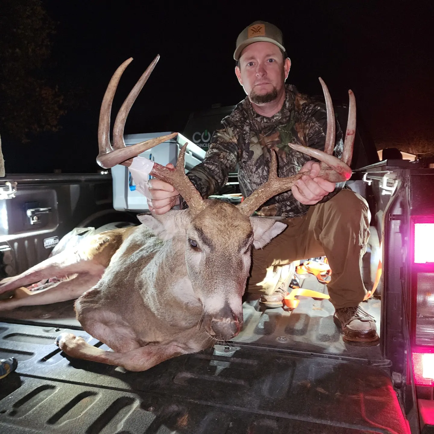 Hunter and harvested deer pictured on the bed of a pickup truck.