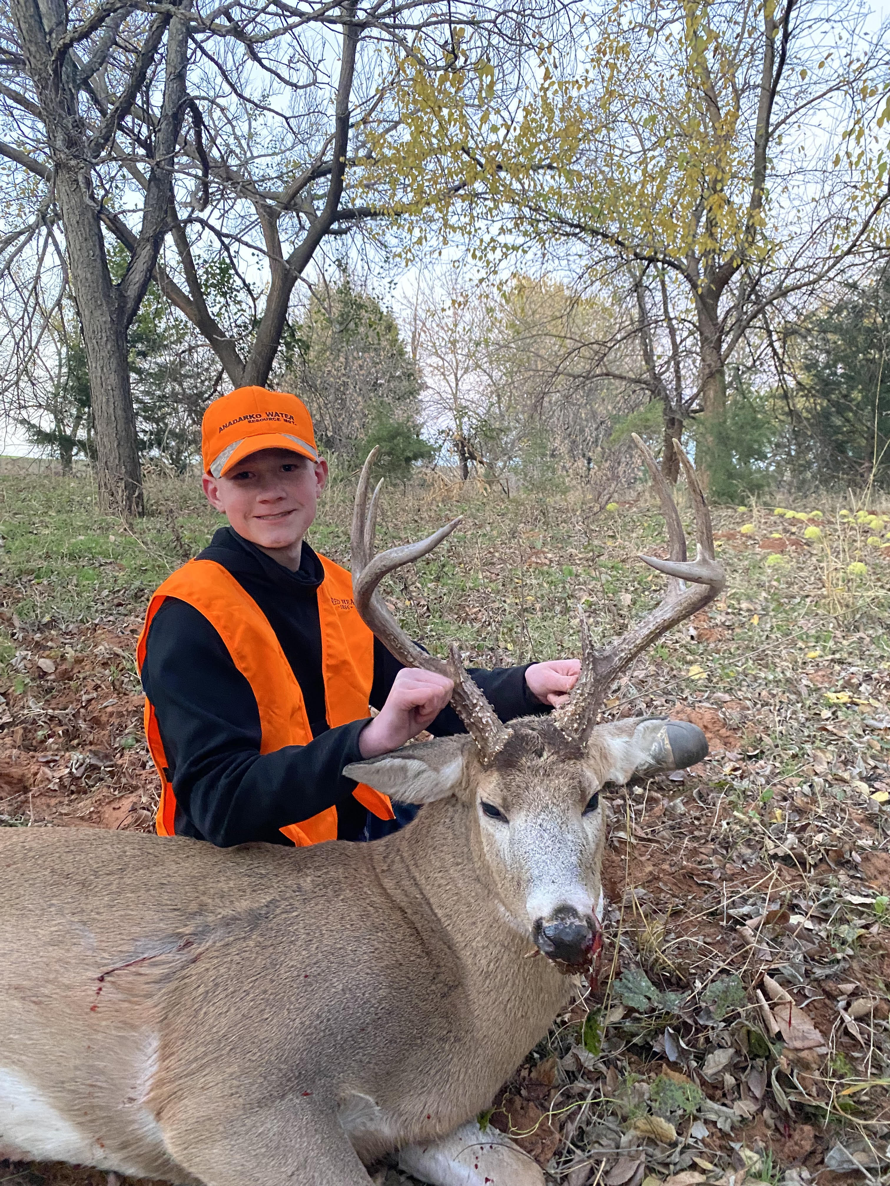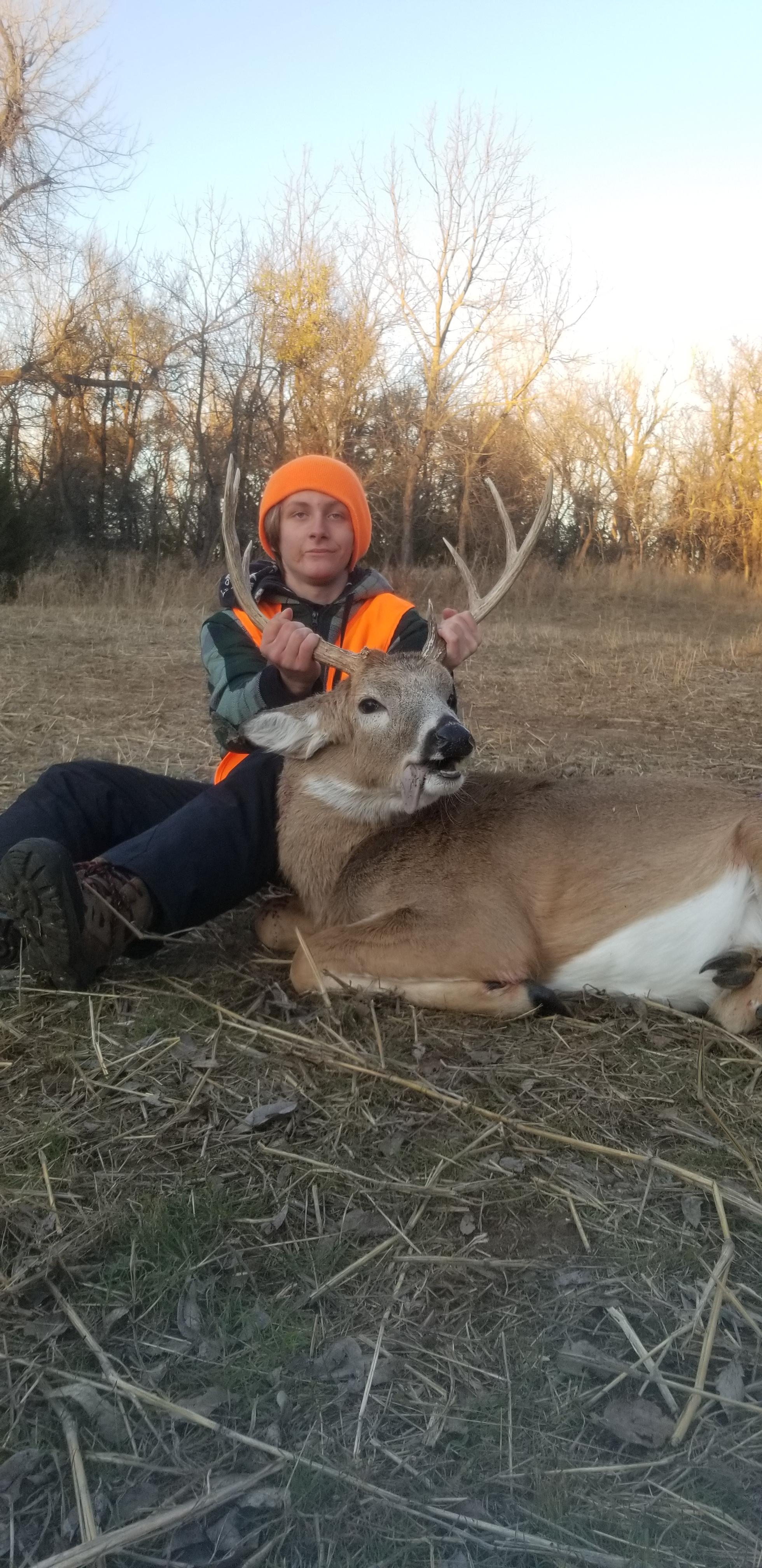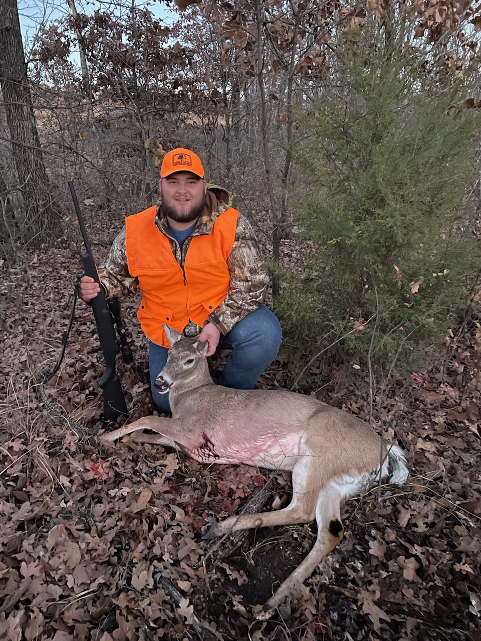 Hunter wearing orange pictured with his first harvested deer.