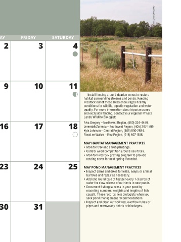 Lands Wildlife Biologist: and exclusion fencing, contact your regional Private Alva Gregory – Northwest Region, (580) 334-4459. Jeremiah Zurenda – Southwest Region, (405) 397-1599. Kyle Johnson – Central Region, (405) 590-2584. RosaLee Walker – East Region, (918) 607-1518. MAY HABITAT MANAGEMENT PRACTICES • Monitor tree and shrub plantings. • Control weed competition around new trees. • Monitor livestock grazing program to provide nesting cover for next spring if needed. MAY POND MANAGEMENT PRACTICES • Inspect dams and dikes for leaks
