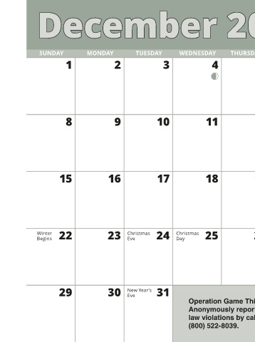 THURSDAY SATURDAY FRIDAY 7 6 5 14 13 12 21 20 19 Now is the time to plant native range seed mixtures to restore native plant communities on your property. Native vegetation is the most desirable source of food and cover for native wildlife including but not limited to white-tailed deer, bobwhites, wild turkey, pollinators and more. For more information on how any why native vegetation is preferred wildlife habitat, visit www.tinyurl.com/PlantNative. 28 27 26 DECEMBER HABITAT MANAGEMENT PRACTICES • Construct or inspect firebreaks around your property and
