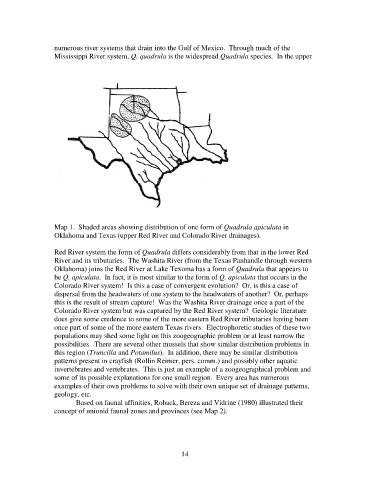 Map 1. Shaded areas showing distribution of one form of Quadrula apiculata in