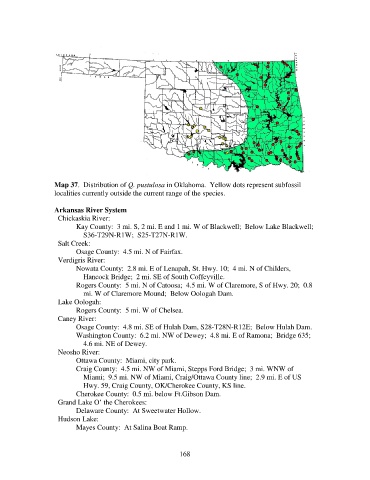Map 37. Distribution of Q. pustulosa in Oklahoma. Yellow dots represent subfossil