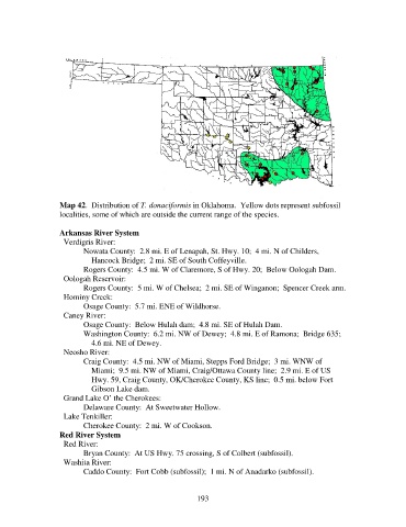 Map 42. Distribution of T. donaciformis in Oklahoma. Yellow dots represent subfossil