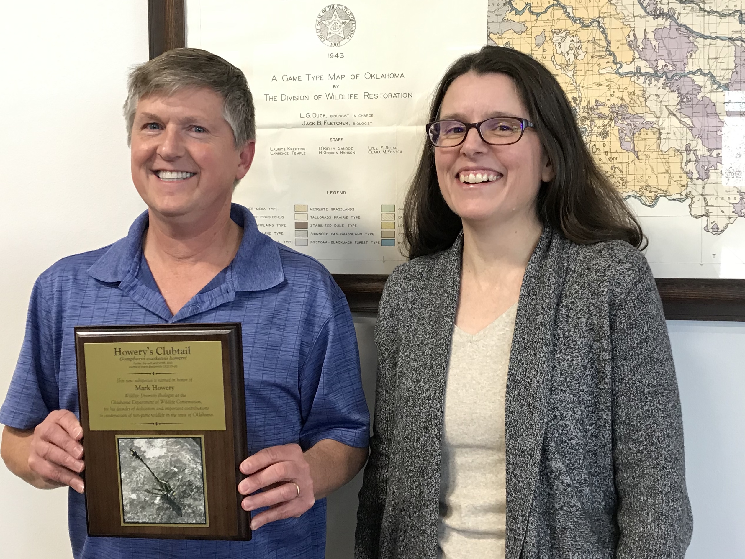 Howery’s clubtail, a subspecies of the Ozark clubtail dragonfly, was recently investigated by Michael A. Patten and Brenda D. Smith (pictured right) and named for Wildlife Department biologist Mark Howery (pictured left).