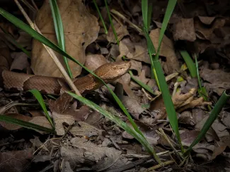 The copperhead’s incredible camouflage not only helps the snake avoid detection from potential predators, but also from potential prey. Allen described the adult snakes as ambush predators that spend time in brushy or leaf-littered areas as well as near water sources, where their prey of small rodents and amphibians may be found.