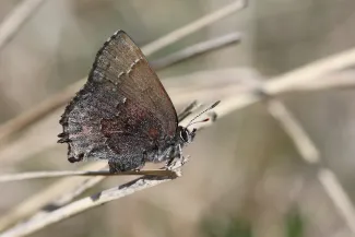 The frosted elfin is a small, grayish brown butterfly that has a dusting of pale-colored scales and short tails on the hindwings.