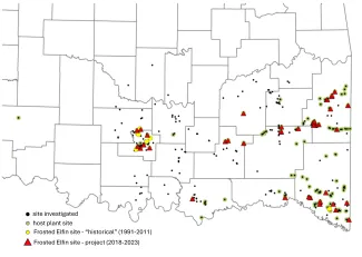 The Oklahoma Frosted Elfin Project was initially funded by the Oklahoma Natural Heritage Inventory and later by the Wildlife Department and U.S. Fish and Wildlife Service through the Cooperative Endangered Species Fund with matching resources provided by the Oklahoma Natural Heritage Inventory in 2021, 2022, and 2023.