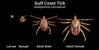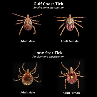 The coloration and size of the dorsal shield can help in identification. The shield of both male and female Gulf Coast ticks (top) are mottled whereas the shield of a male lone star tick (bottom left) is mostly unmarked with white dots on the bottom edge, and the shield of a female lone star tick (bottom right) is marked with a single dot at the base of the shield. The shield covers the majority of the body in males of both species and only covers the front of the body in females of both species.