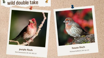 In Oklahoma, bird watchers and biologists have documented at least 12 species in the finch family, including two brightly colored finches that may visit winter bird feeders. A wild double take of the purple and house finches can reveal subtle differences in the amount of reddish coloration observed on the males, patterning of females, and the degree of notching of the tail.