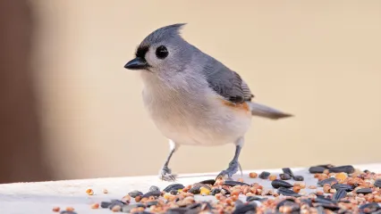 At feeders, tufted titmice eat black-oil sunflower seed, suet and miracle meal. Away from feeders they forage on insects, some seeds, acorns and small fruits. They are usually found in small groups of two to eight birds. Tufted titmice are very acrobatic and spend most of their time foraging on tree branches and wildflower stalks. They commonly take seeds one by one and flies to a nearby tree to open them. Seeds are opened by placing them between the feet and pounding the shell apart with its bill. In winter, it moves throughout the neighborhood in mixed flocks of Carolina chickadees, brown creepers and nuthatches.
