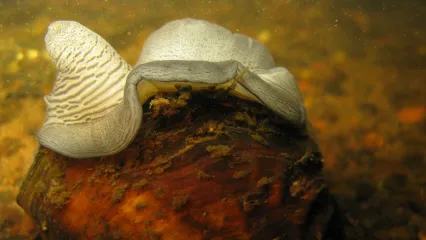 This freshwater clam is approximately four inches in length. The shell has multiple, characteristic bumps and varies in color from greenish to dark brown.